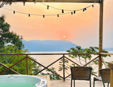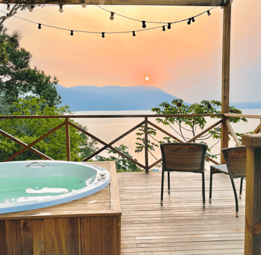 Relaxe na jacuzzi com vista para o mar e montanhas, pura tranquilidade.